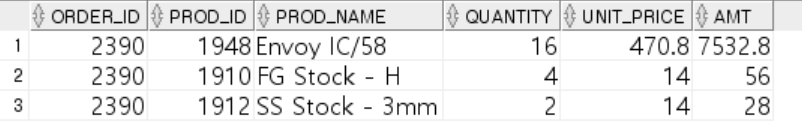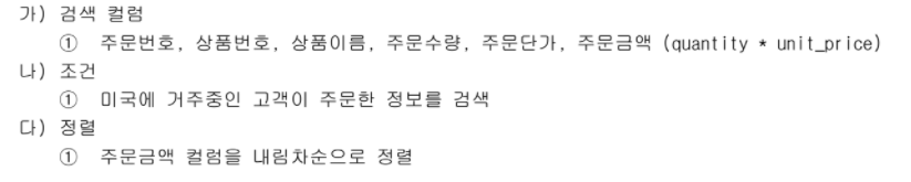5. 상품 테이블(prods)과 주문 상세 테이블(order_items), 주문 테이블(orders), 고객 테이블(custs)을 이용하여 미국에서 거주하는 고객이 주문한 상품의 번호와 이름, 주문 수량, 주문 단가, 주문 금액을 조회하세요