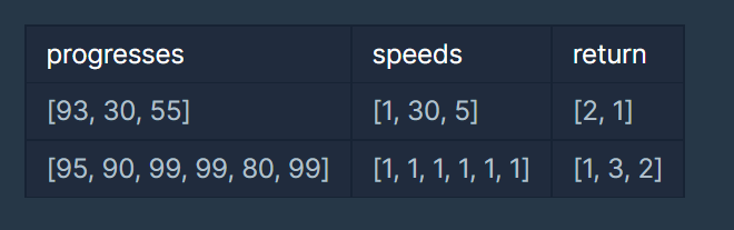 ๋จผ์ ๋ฐฐํฌ๋์ด์ผ ํ๋ ์์๋๋ก ์์ ์ ์ง๋๊ฐ ์ ํ ์ ์ ๋ฐฐ์ด progresses์ ๊ฐ ์์ ์ ๊ฐ๋ฐ ์๋๊ฐ ์ ํ ์ ์ ๋ฐฐ์ด speeds๊ฐ ์ฃผ์ด์ง ๋ ๊ฐ ๋ฐฐํฌ๋ง๋ค ๋ช ๊ฐ์ ๊ธฐ๋ฅ์ด ๋ฐฐํฌ๋๋์ง๋ฅผ return ํ๋๋ก solution ํจ์๋ฅผ ์์ฑํ์ธ์.