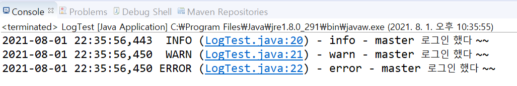 - 2021-07-28 16:50:46,350 INFO (LogTest.java:18) - master 로그인 했다 ~~