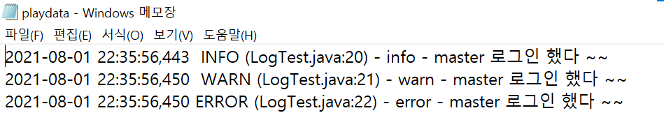 //2021-07-28 16:50:46,350 INFO (LogTest.java:18) - master 로그인 했다 ~~