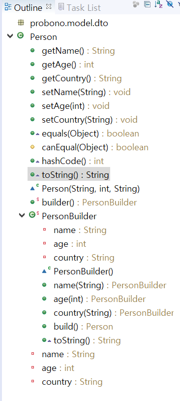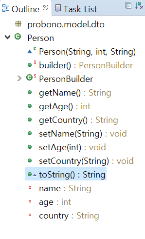 import lombok.Builder; import lombok.Getter; import lombok.Setter; import lombok.ToString; @Builder @Getter @Setter @ToString public class Person { private String name; private int age; private String country; }