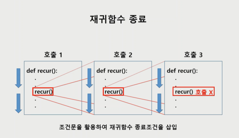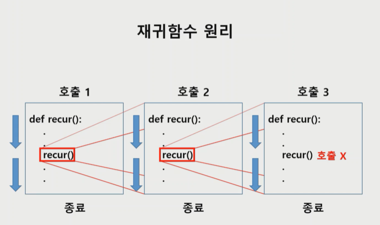 재귀함수를 작성할 때는 함수 내에서 다시 자신을 호출한 후 그 함수가 끝날 때까지