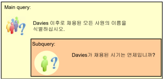 Subquery는 Mainquery 전에 실행 된다. Subquery의 결과가 Mainquery에서 사용 된다. Mainquery alias를 Subquery가 따른다. Subquery는 괄호()로 묶는다. 가독성을 위해 비교 조건의 오른쪽에 Subquery를 배치. 그러나 비교 연산자의 양쪽 모두에 사용 가능.