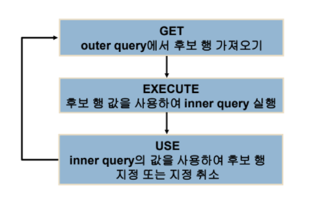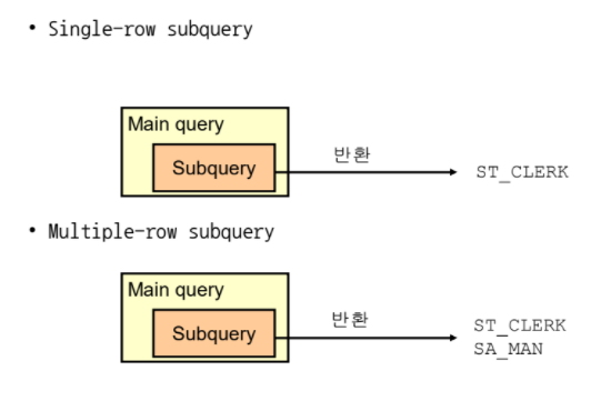 Subquery 유형 Single-row subquery - 단일 행 연산자 Multiple-row subquery - 다중 행 연산자 Correlated subquery - 행 단위 처리에 사용, 각 subquery는 outer query의 모든 행에 한번씩 실행