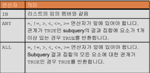 IN 연산자 - ( = + or) 와 같다. NOT IN 연산자 - ( = + and) 와 같다. Subquery의 null값은 Mainquery에 연산이 안됨